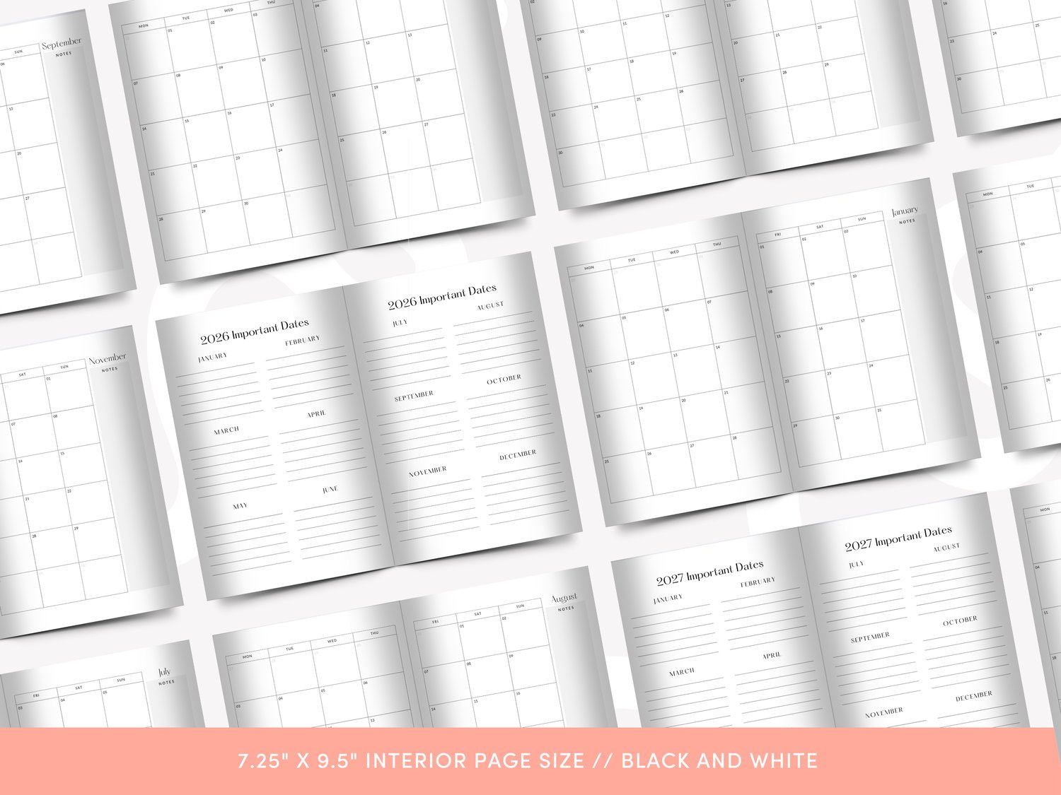 Covering 2025 through to 2030, this template features a clean and stylish monthly double-page spread. It also has an “important dates” page covering each month of every year.