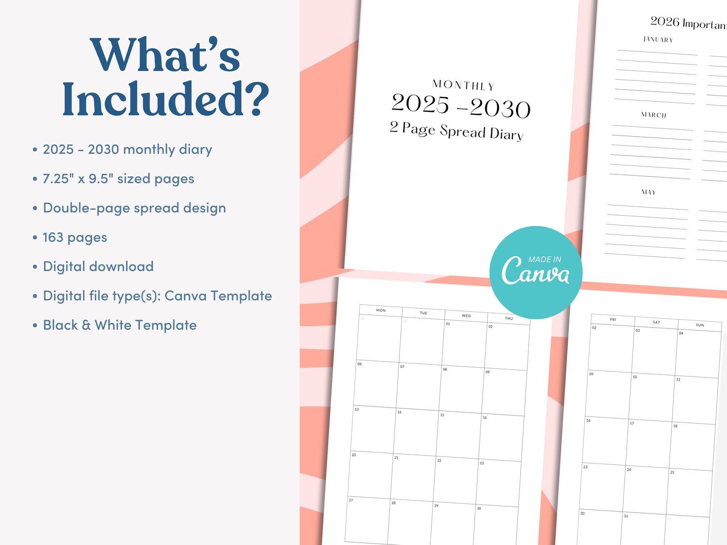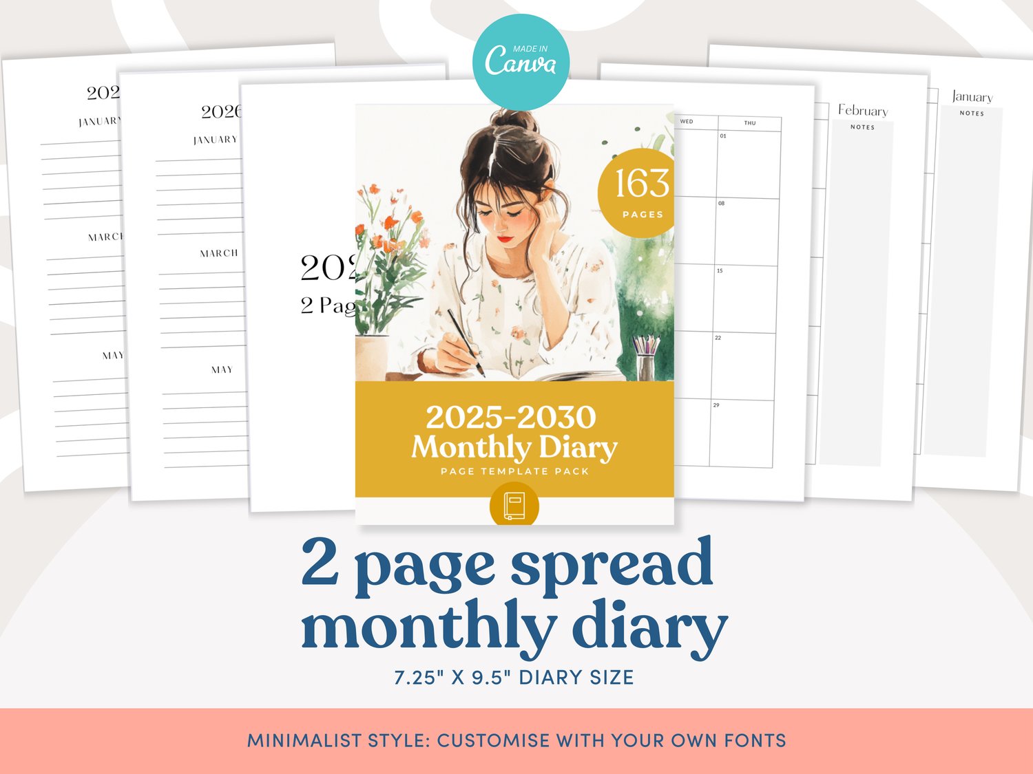 2025 - 2030 Monthly Diary KDP Template Pack | Canva Editable | 6x9 with Bleed | 163 Page Double-Page Spread Diary for Low Content Books | Immediate Access to Download After Purchase | KDP tested