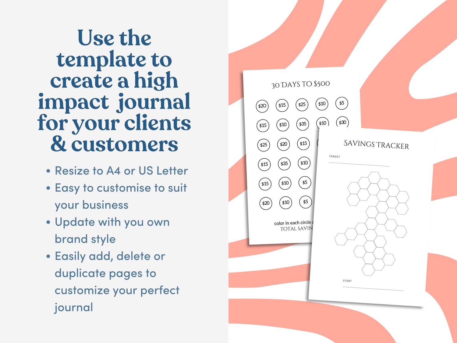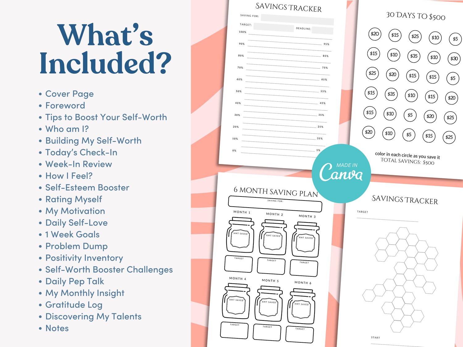 The handy tracker includes a range of pre-designed saving challenges. These include saving $1 to $10 a day, 30-day goals, and flexible target trackers. Each page is perfectly laid out and formatted for easy editing in Canva.