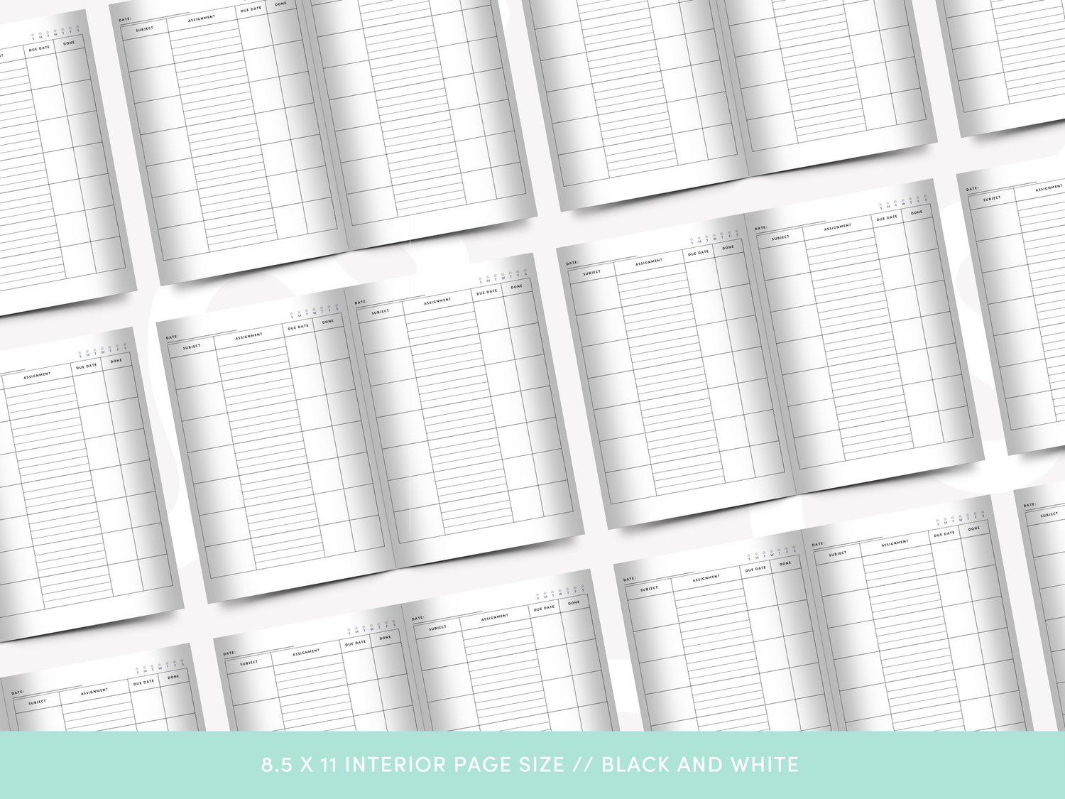 - Each page features a table to fill in the date, subject, assignment, due date, and a check once complete