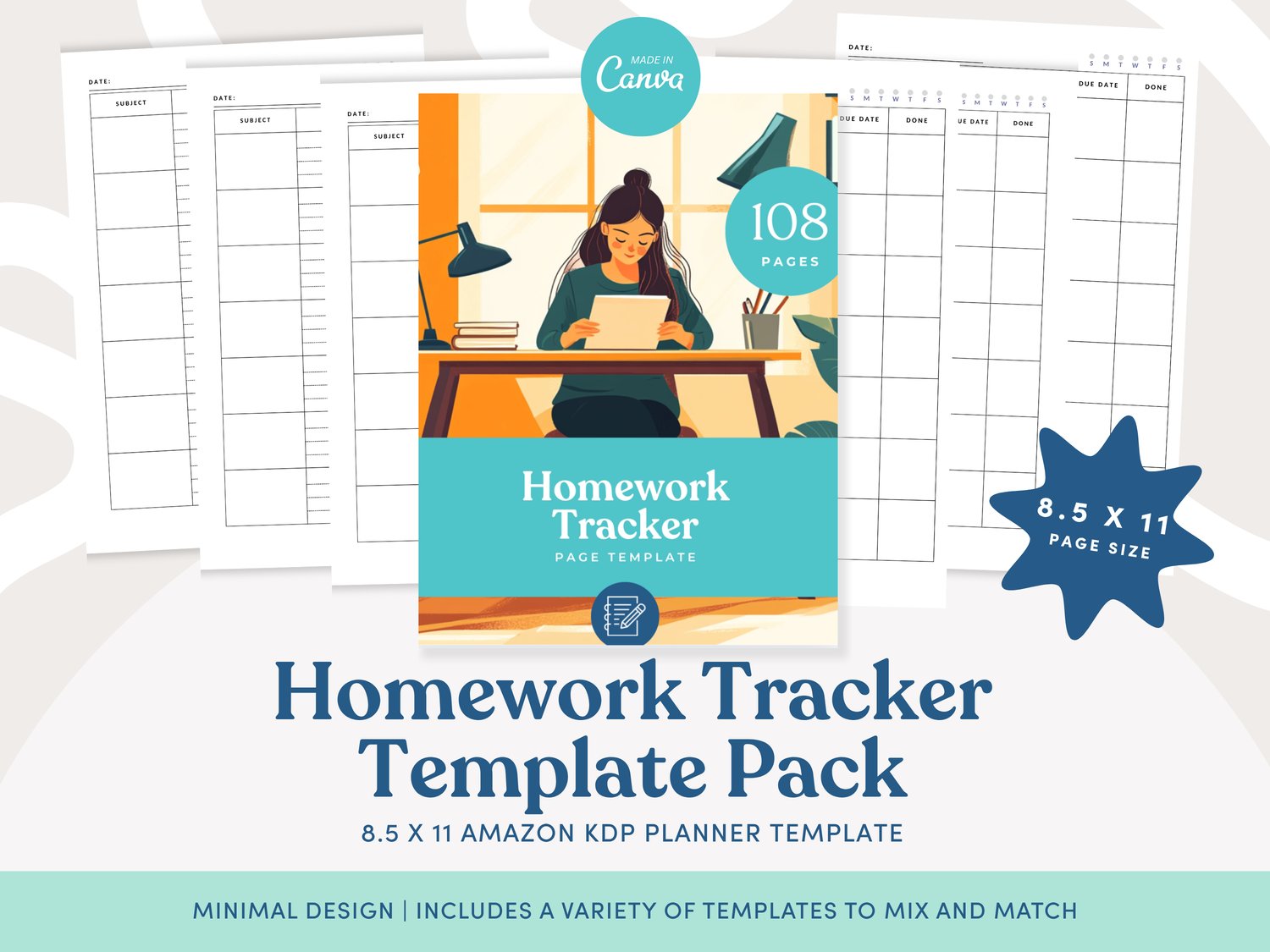 Homework Planner KDP Template Pack | Canva Editable | 8.5x11 (US Letter) with Bleed | 100 Page Homework Planner for Low Content Books | Immediate Access to Download After Purchase | KDP tested