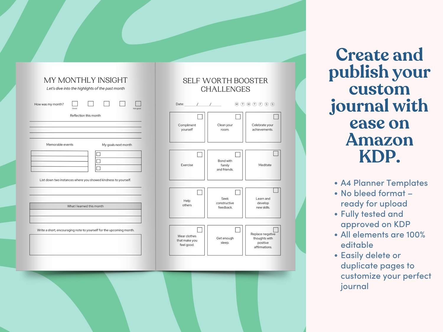 Ideal for book sellers looking to create low-content books, this life planner features pages for tracking moods, planning meals, budgeting, weight loss, and more. Better still, it’s incredibly easy to personalise with your branding and style, so you can start selling right away.
