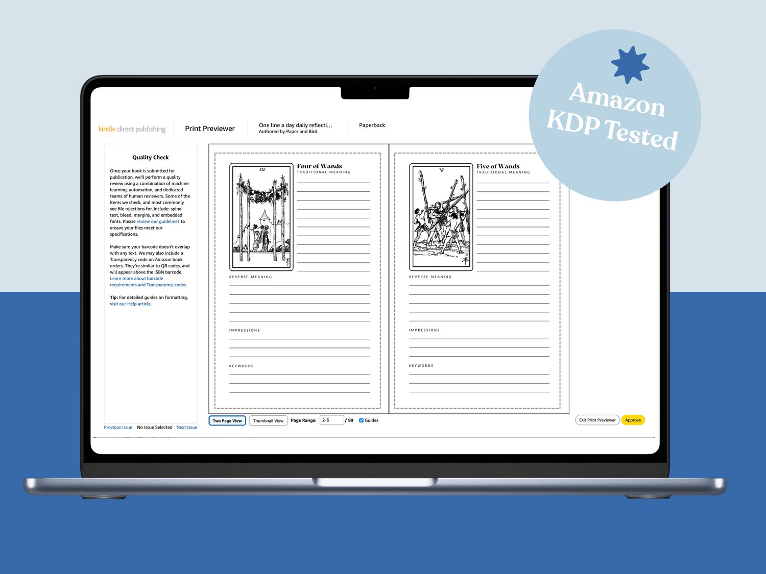 Tailored for commercial use, this beautiful tarot workbook template is designed to be customised by you, ready to sell to your customers through Amazon KDP.