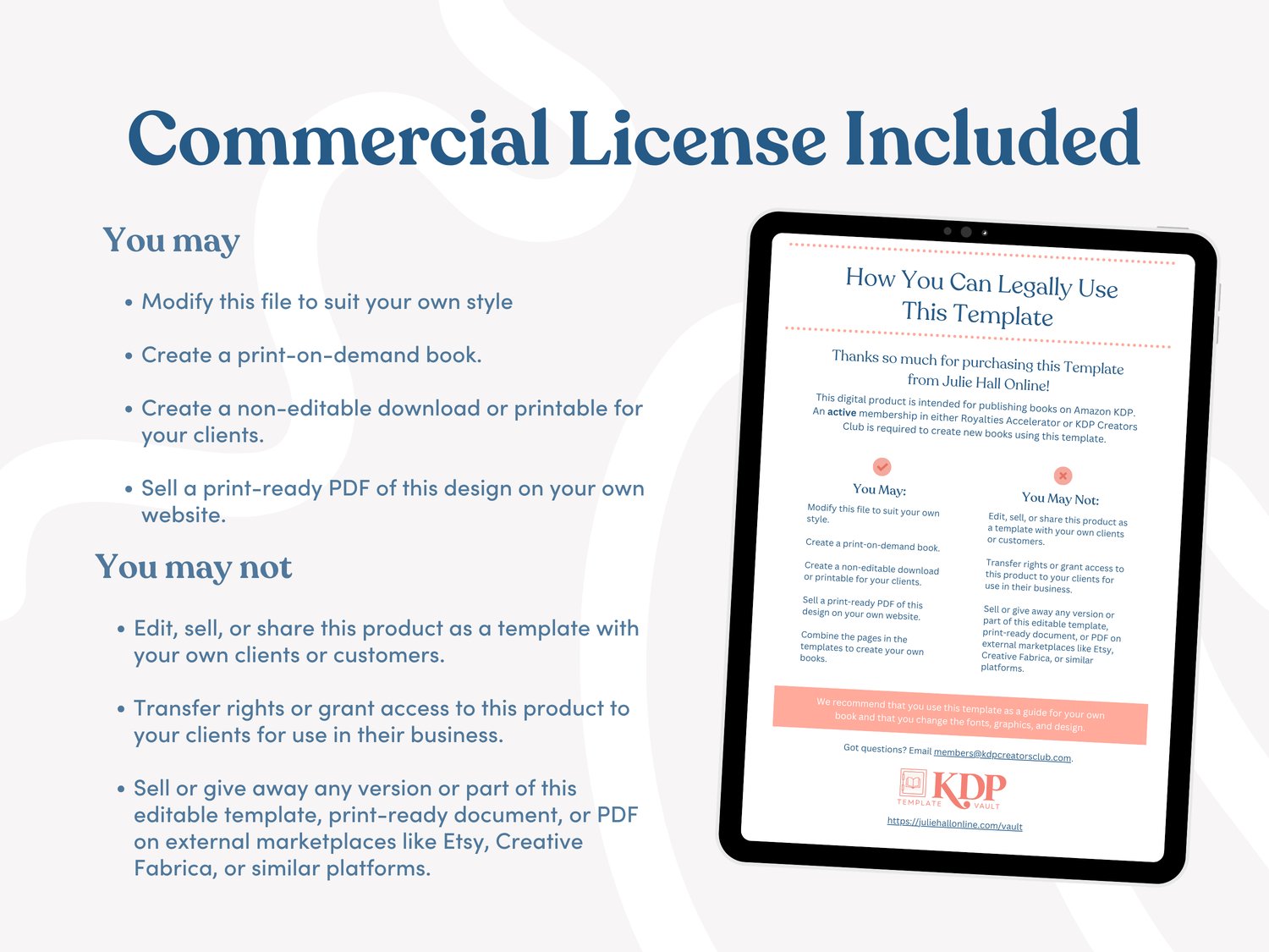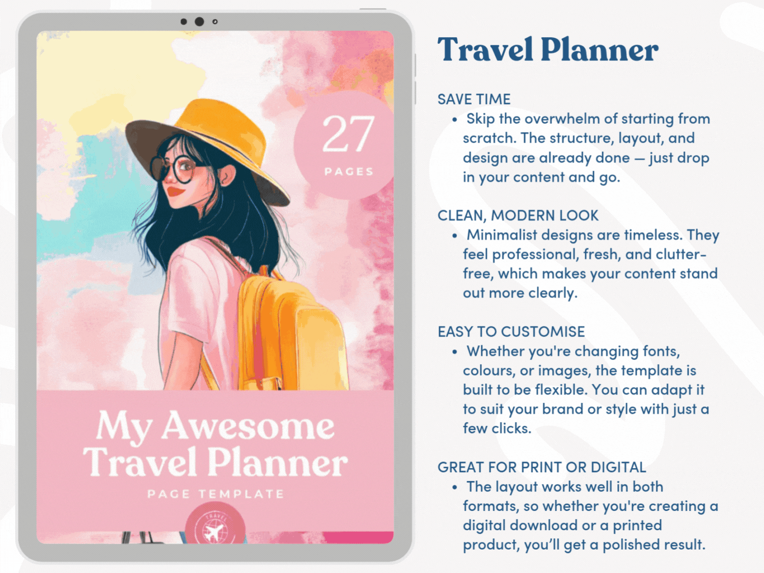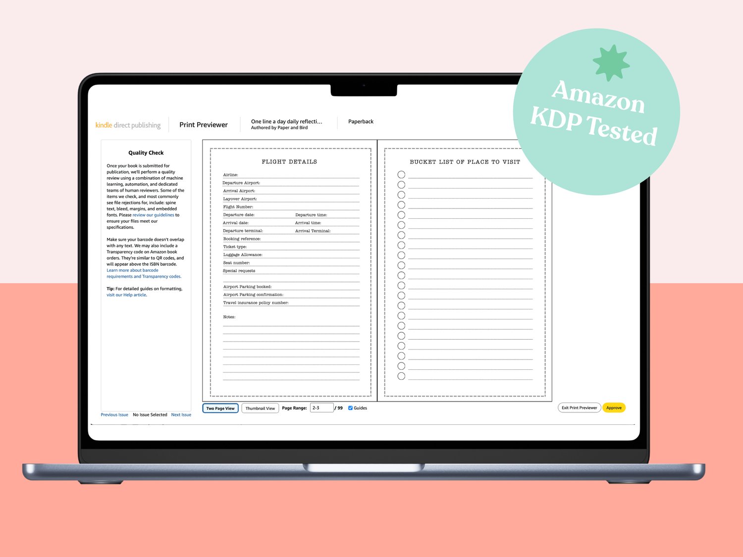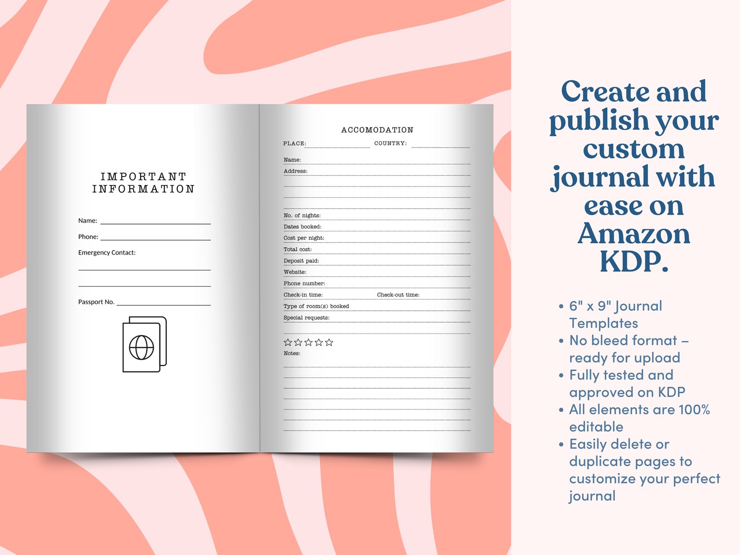 Tailored for commercial use, this travel planner template is designed to be customised by you, ready to sell to your customers through Amazon KDP.