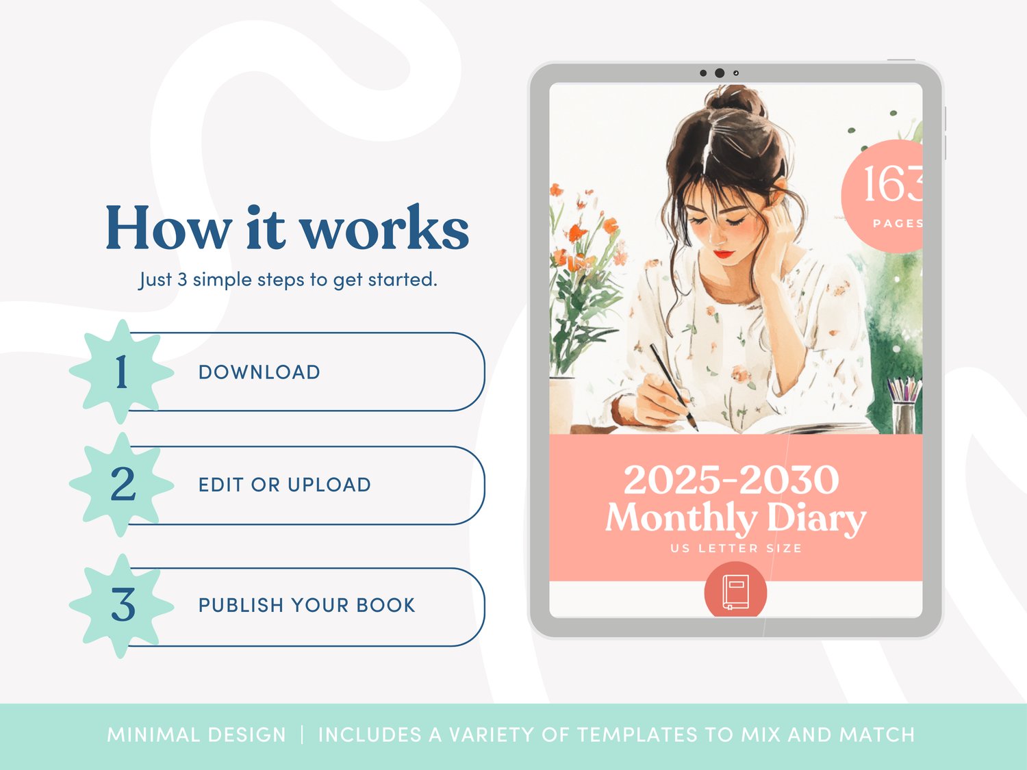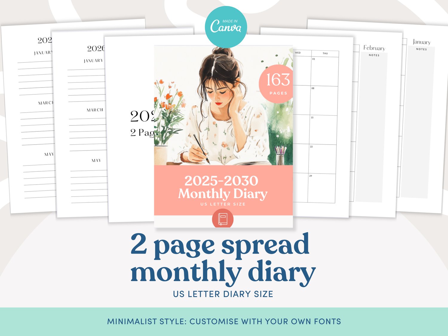 2025 - 2030 Monthly Diary KDP Template Pack | Canva Editable | 6x9 with Bleed | 163 Page Double-Page Spread Diary for Low Content Books | Immediate Access to Download After Purchase | KDP tested